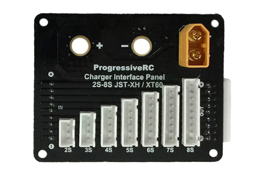 This 2S-8S JST-XH Charger Interface Panel (or CIP) provides a set of balance connectors, an EC5, XT60, or XT90 connector, and room for a set of banana plugs (available separately). This product is made to be mounted underneath or on top of many surfaces and panels, such as our ProgressiveRC Case decks, and provides a full relocation of the charger outputs with a full balance board as well as a main charge connector - choose from EC5, XT60, or XT90.